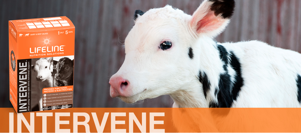 Lifeline Intervene is a supplement for young beef and dairy calves when extra nutritional support is needed. When used as directed, Intervene provides important functional proteins, electrolytes, vitamins and minerals, as well as extra fluids.
